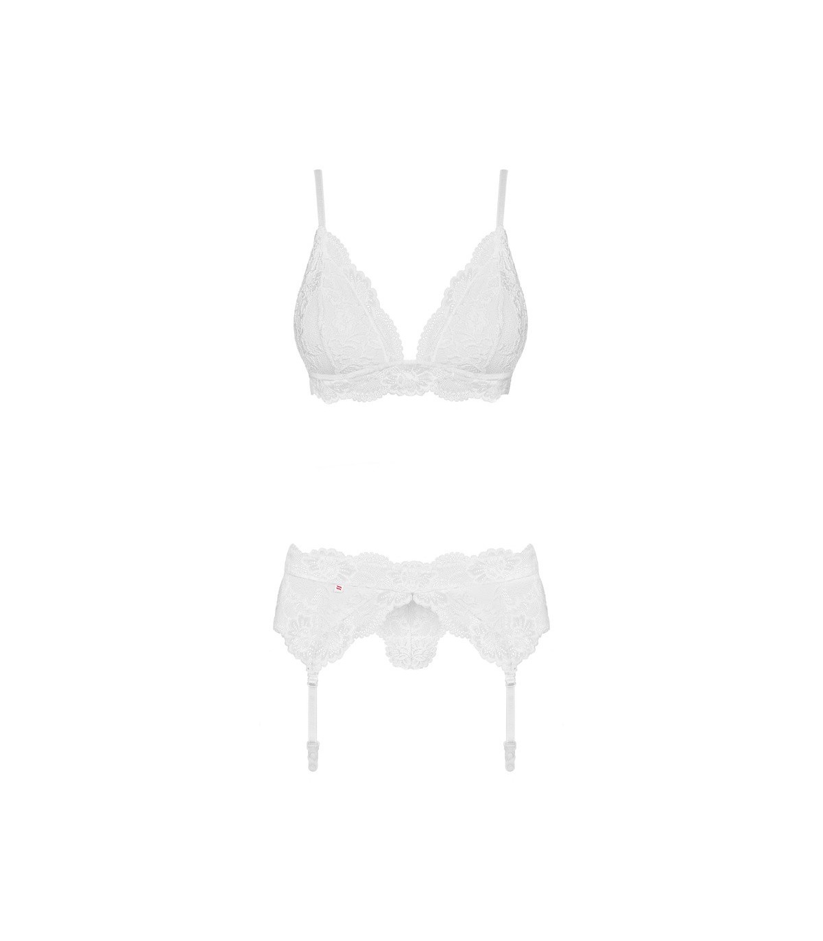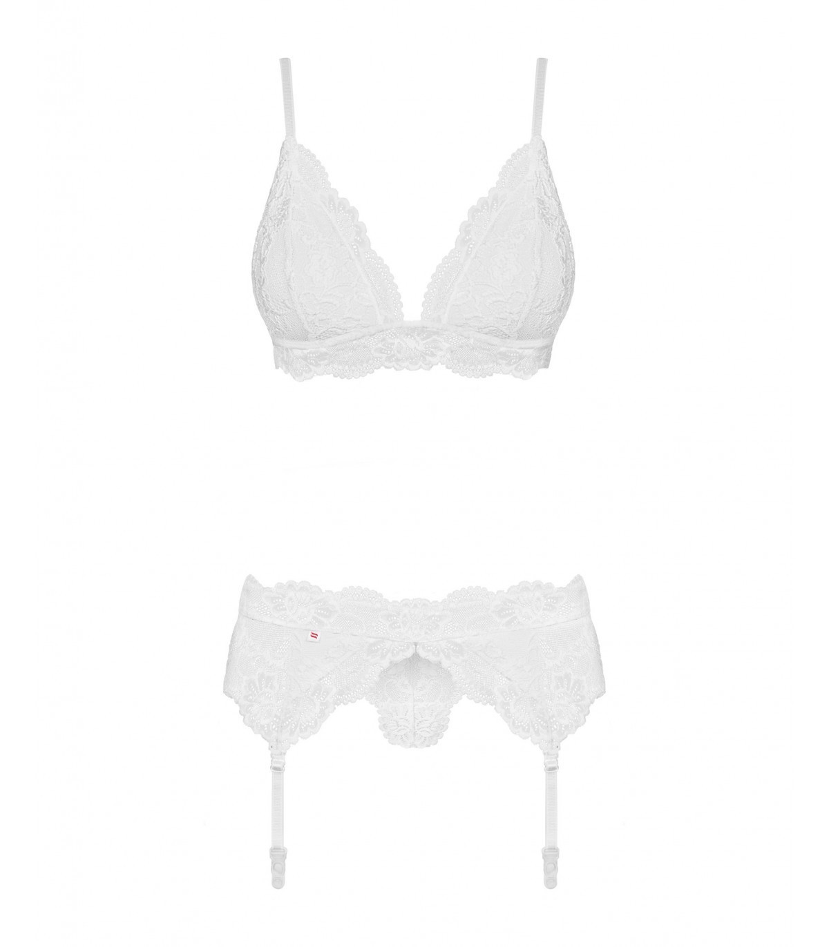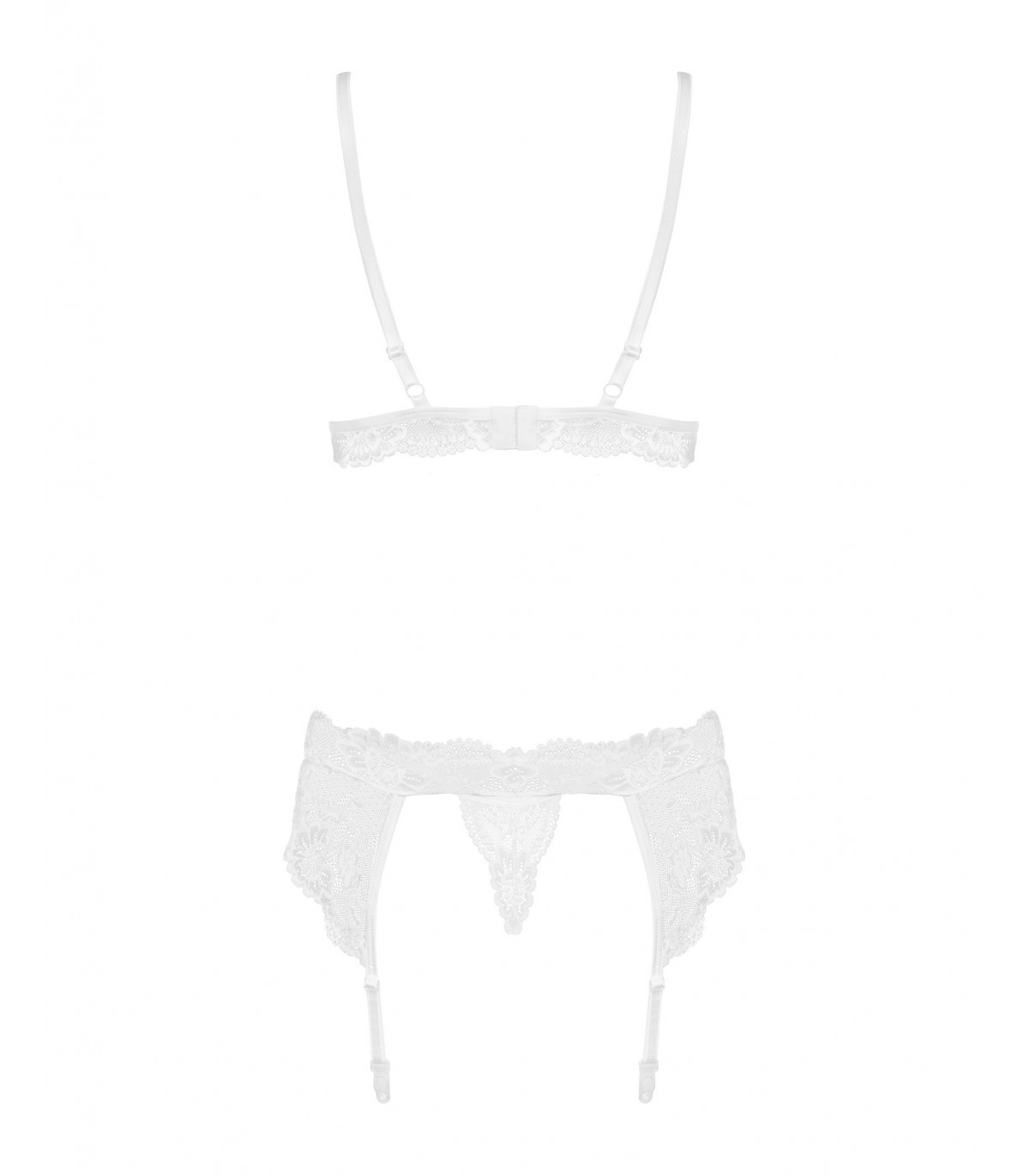Encaje blanco, decoraciones sexys, un corte sensacional que enfatiza la feminidad y una pizca de especias: esto es lo que tienta el conjunto de la colección 810. Las copas triangulares del sujetador resaltan perfectamente el pecho y el tanga clásico garantiza una bella apariencia de las caderas y el trasero. El sensual liguero quedará fantástico con unas medias a juego. Descubra más detalles:
