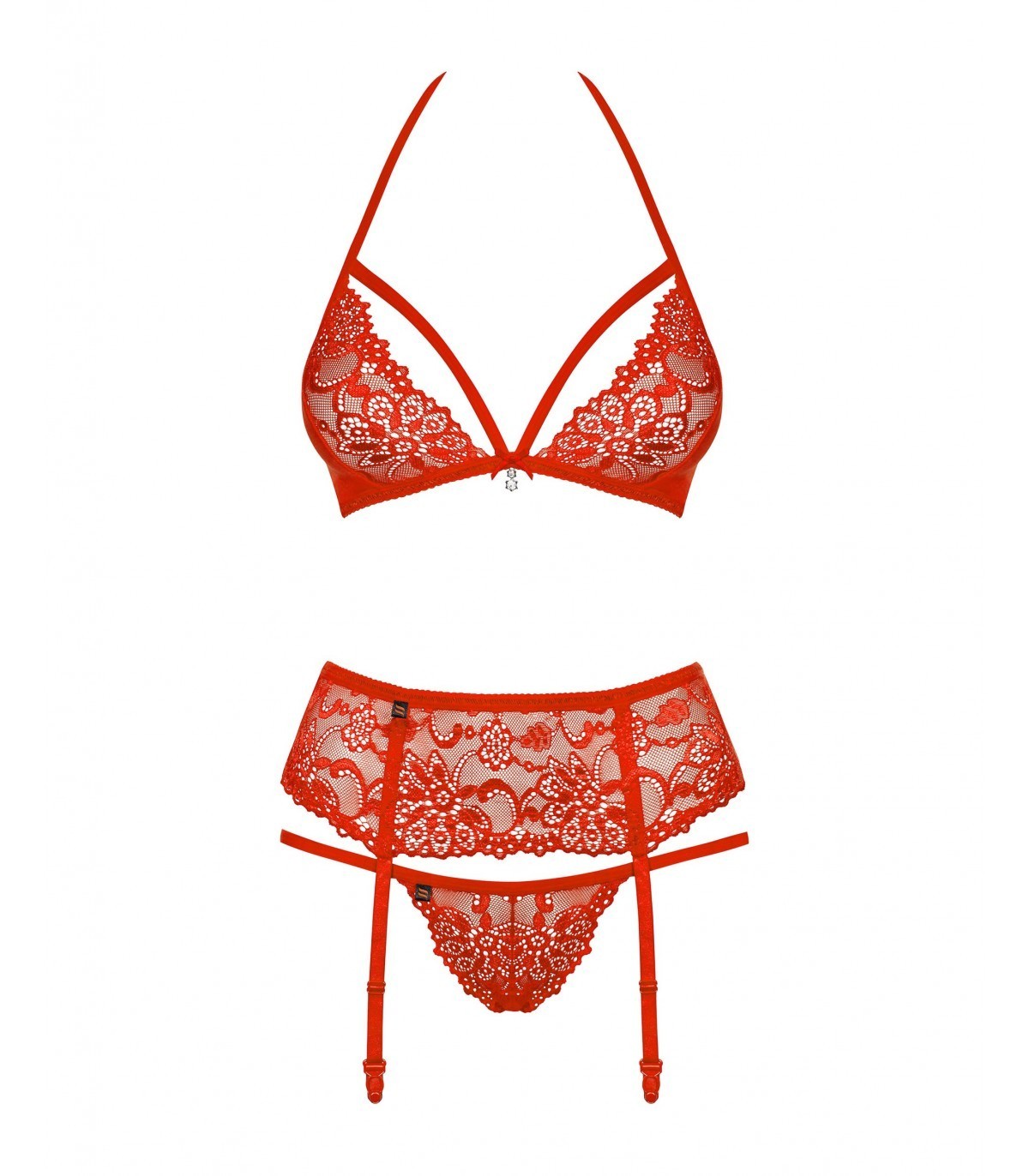 – el conjunto incluye sujetador, liguero y tanga (¡luce aún más atractivo cuando le agregas medias!)