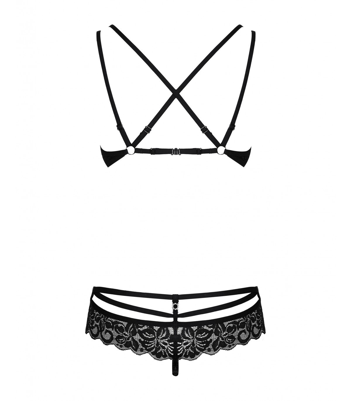 ¿Qué tal un negro atemporal, correas intrigantes y detalles brillantes? Estos son los elementos del atrevido y extremadamente sexy conjunto 860-SET-1. Este efecto único está garantizado por las correas que envuelven todo el cuerpo. cuerpo realzan las caderas y realzan el busto. Están intrincadamente cruzados en la espalda, tanto en el sujetador como encima de la braguita. El conjunto está rematado con un encaje delicado y sensual que le dará elegancia y elegancia.