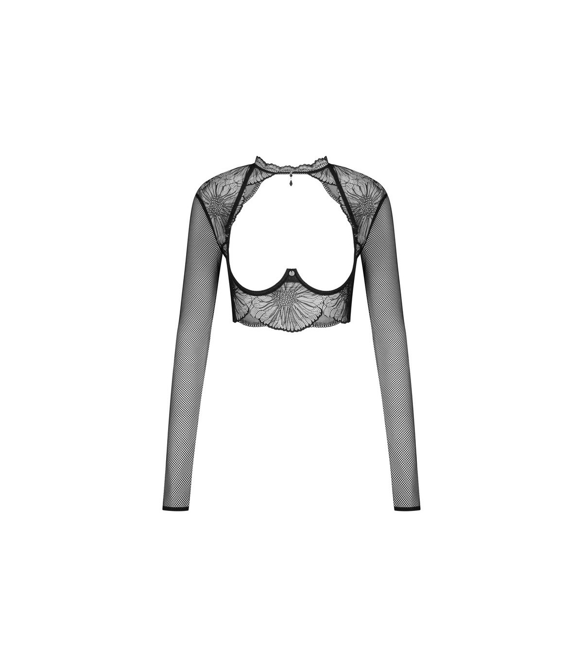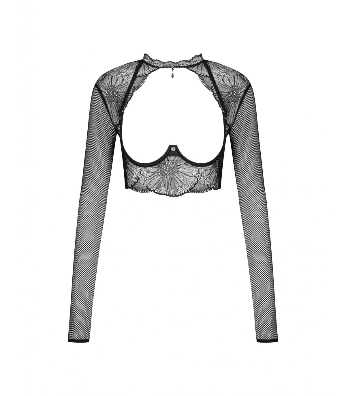 Mibelia es una elección atrevida y extremadamente atractiva entre nuestros tops con su encaje floral en el centro de atención. Copas abiertas, mangas largas, corte que deja ver el vientre y un escote profundo y pronunciado en la espalda. Como la guinda del pastel, el El cuello está decorado con un colgante de bisutería. Quedará precioso solo o en combinación con un sujetador y unas bragas de la misma colección.