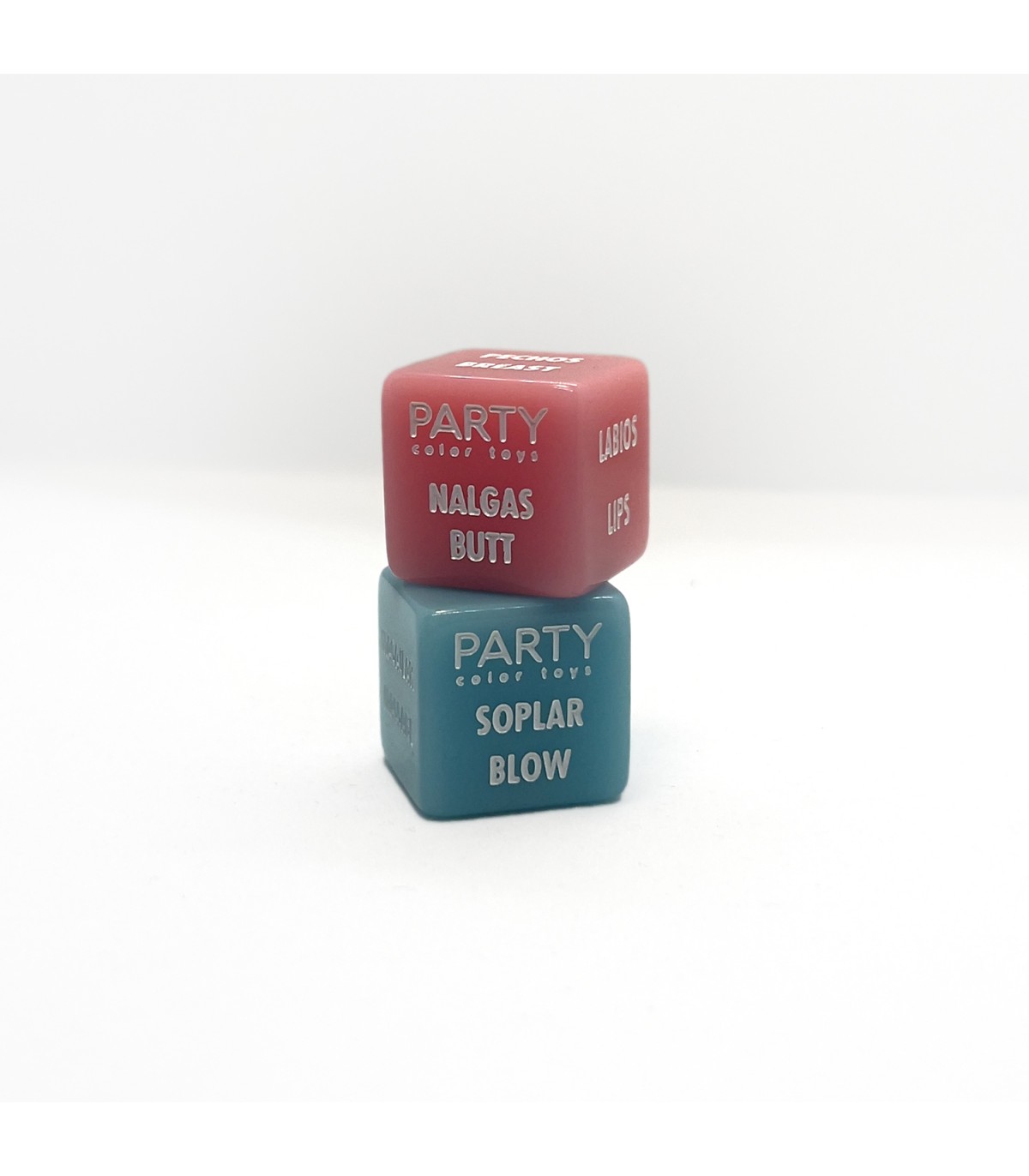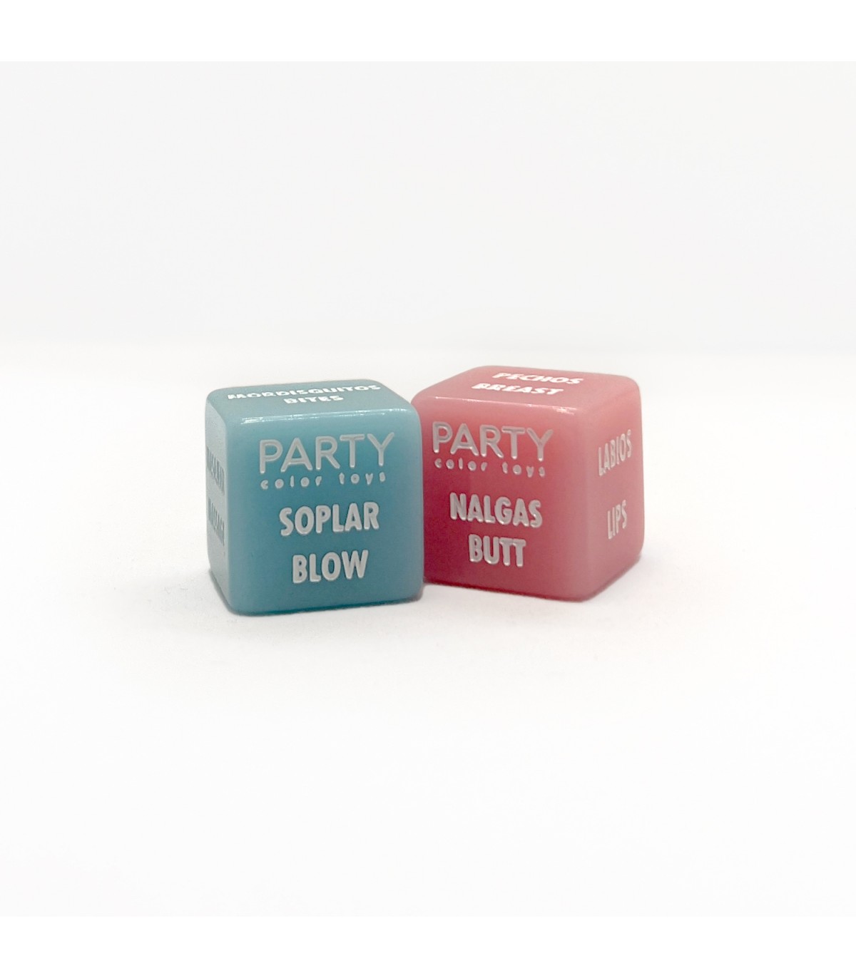 El dado rosa lleva 6 partes del cuerpo en cada una de sus caras: Labios, Orejas, Cuello, Nalgas, Pecho, Entrepierna.